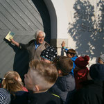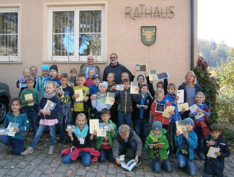 Beim, vom Museumsverein gestifteten Vesper, ließen es sich alle schmecken. Ein Dank an Ingrid Ochs für die nette Bewirtung. Nach dem Eintrag ins Gästebuch, ging´s unters Dach, wo Herr Giemulla und Dennis bereits sämtliche Eisenbahnen und weitere Fahrzeuge in Gang gesetzt hatten. Die Schüler schauten und staunten. 25 Gleise nebeneinander….Nach einem kurzen Aufenthalt auf dem Kirchplatz, waren wir alle gespannt auf das „Brathaus“ J. Herr Bereska empfing uns in seinem Amtszimmer mit Gitarre und Jongliereinlage. Anschließend durften die Schüler im großen Sitzungssaal Platz nehmen und erfuhren wie eine Gemeinderatssitzung abläuft. Zahlreiche Fragen an den Bürgermeister wurden gestellt. Die Kinder nahmen eine kindgerechte Broschüre zur Funktion der Gemeindeverwaltung mit und das spontane Versprechen für drei neue Fußbälle. Herzlichen Dank dafür!